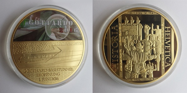 Gigantisch grosse Prägung zur Eröffnung des Gotthard Basistunnels 2016.