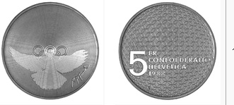 Wertseite: Die Wertseite besteht aus vielen ineinander greifenden Kreisen analog den olympischen Ringen. Negativ steht eine grosse 5 geschrieben und von oben nach unten FR / CONFOEDERATIO / HELVETIA / 1988