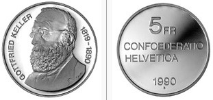 Beschreibung: Anlässlich des 100. Todestages von Gottfried Keller, einem Schweizer Dichter und Politiker, wurde diese Gedenkmünze herausgegeben.