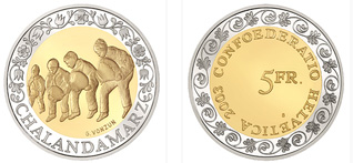 Wertseite: Im Zentrum steht 5 FR und am Rand der goldenen Fläche steht CONFOEDERATIO HELVETICA 2002. Der silberne Rand ist mit einer geschlossenen Blumengirlande verziert.