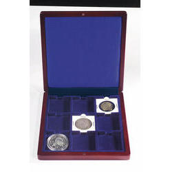 Holz-Münzetui * hochwertiges Münzetui in mahagonifarbener Holzmaserung * Deckelkissen in dunkelblauer Seide * Bodenteil mit vorgeformten Vertiefungen und veloursartiger Oberfläche * 9 quadratische Vertiefungen für Münzen bis 50 mm ø * Aussenmass: 190 x 195 mm