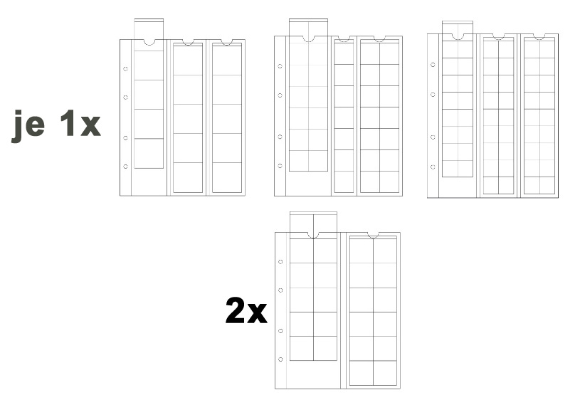5 Hüllen zur Unterbringung von insgesamt 152 Münzen mit unterschiedlichen Durchmessern (20 bis 42 mm Durchmesser). Weichmacherfreie Einschübe. Passend für alle Ringbinder im OPTIMA-Format