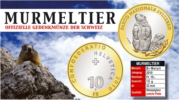 10 Fr. Sonder-Münze 2010, Bimetall, Murmeltier