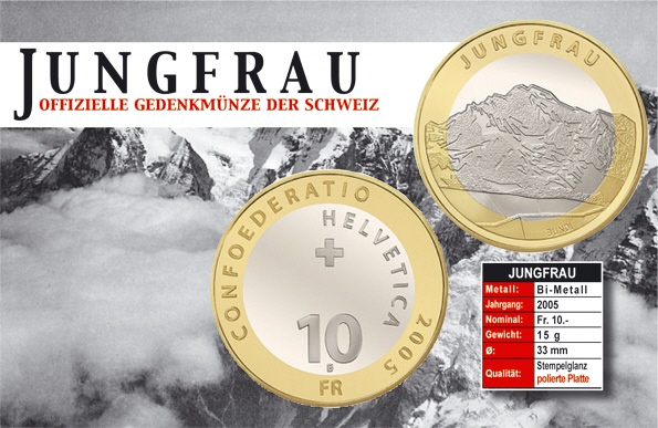 Diese Münze erhalten Sie mit einer Plastikkapsel, in der sie gut geschützt aufbewahrt werden kann. Die Jungfrau ist mit ihren 4158 m nicht der höchste, aber für viele der schönste Berg des Berner Oberlands. Durch ihre Breite, ihre Vorgipfel und ihren Gletscherpanzer wirkt sie beeindruckend.