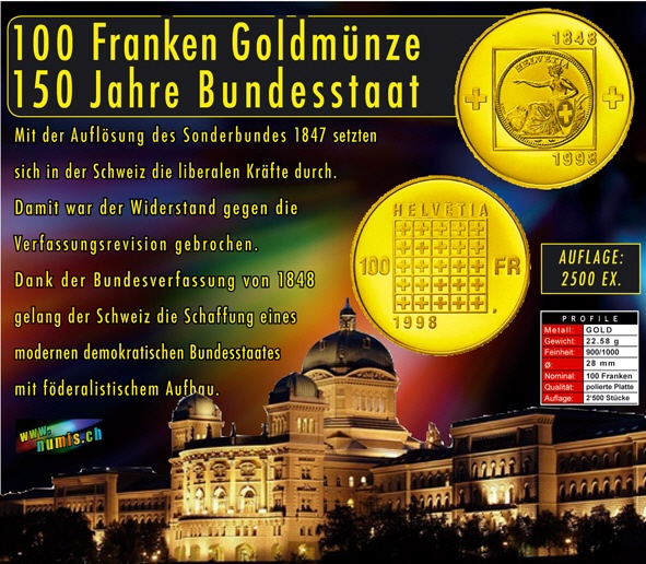 100 Fr. Sonder-Münze 1998 150 Jahre Bundesstaat