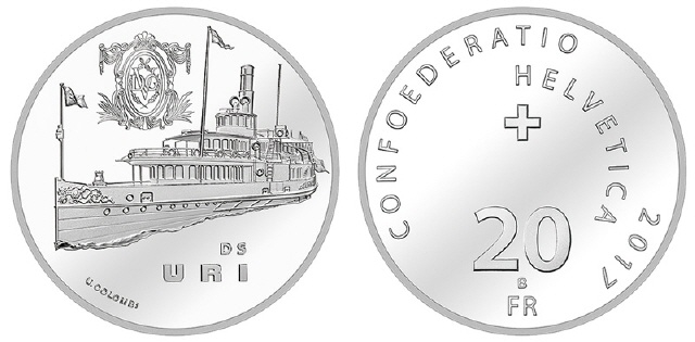 Münzbild: Dampfschiff Uri Nominalwert: 20 Fr. Künstler: Ueli Colombi, Sigriswil Legierung: Silb...