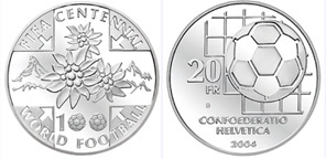 100 Jahre Fifa 2004 20 Franken nur als polierte Platte erhältlich! Sehr kleine Auflage, nur 14`055 Exemplare. Diese Sonder-Münze wurde in der ganzen Welt verkauft, und ist nur noch schwer auffindbar.
