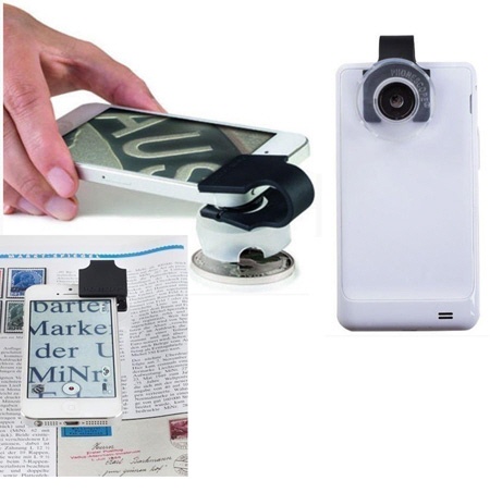 Die Makrolinse verwandelt Ihr Smartphone oder Tablet in ein vollfunktionsfähiges Digitalmikroskop mit bis zu 60-facher Vergrösserung. Über die Kamerafunktion des Smartphones können so feinste Details wie z.B. Prägekennzeichen auf Münzen, Briefmarkendruckverfahren usw. erkannt bzw. geprüft werden. Die vergrösserten Detailansichten lassen sich als Foto oder Video speichern.